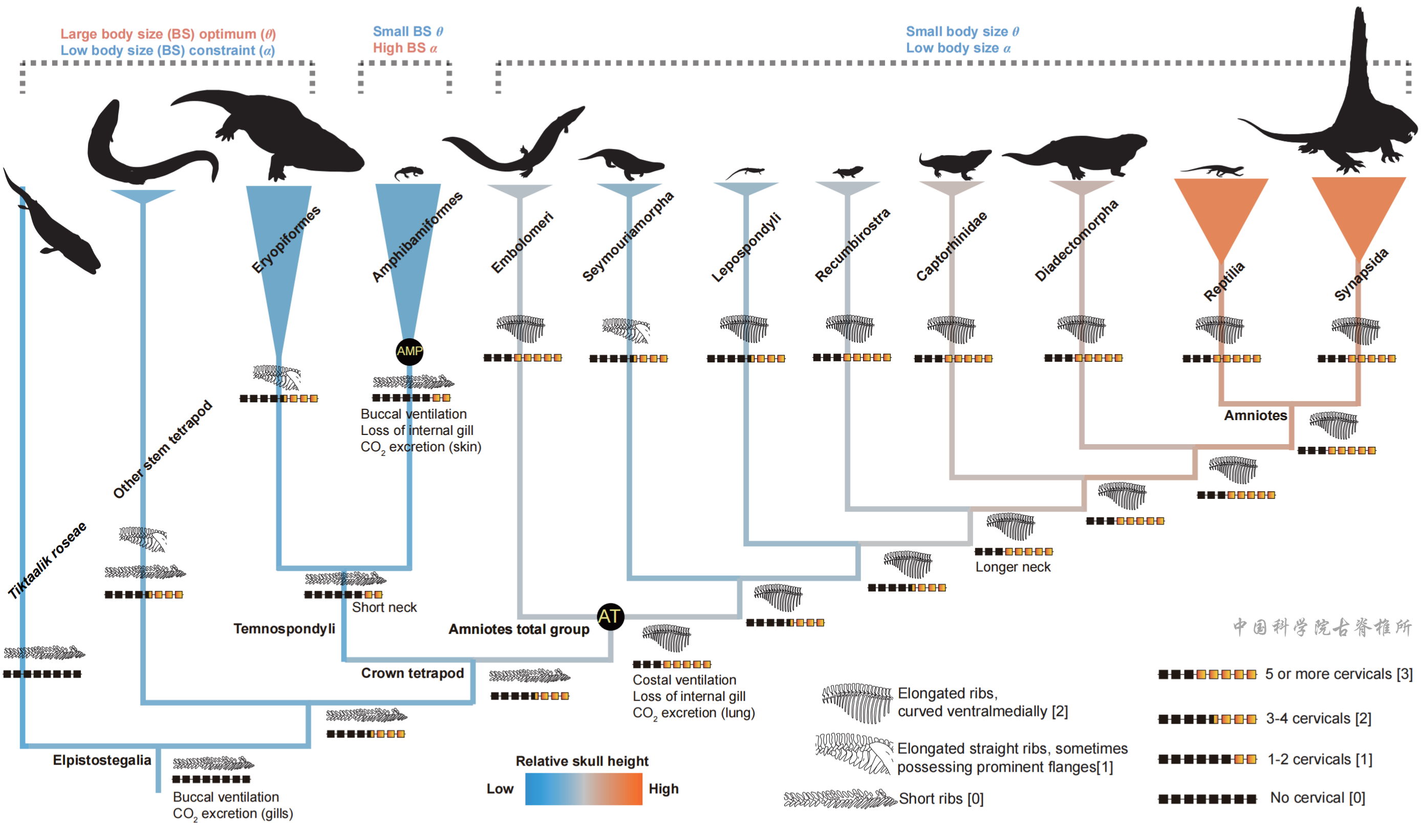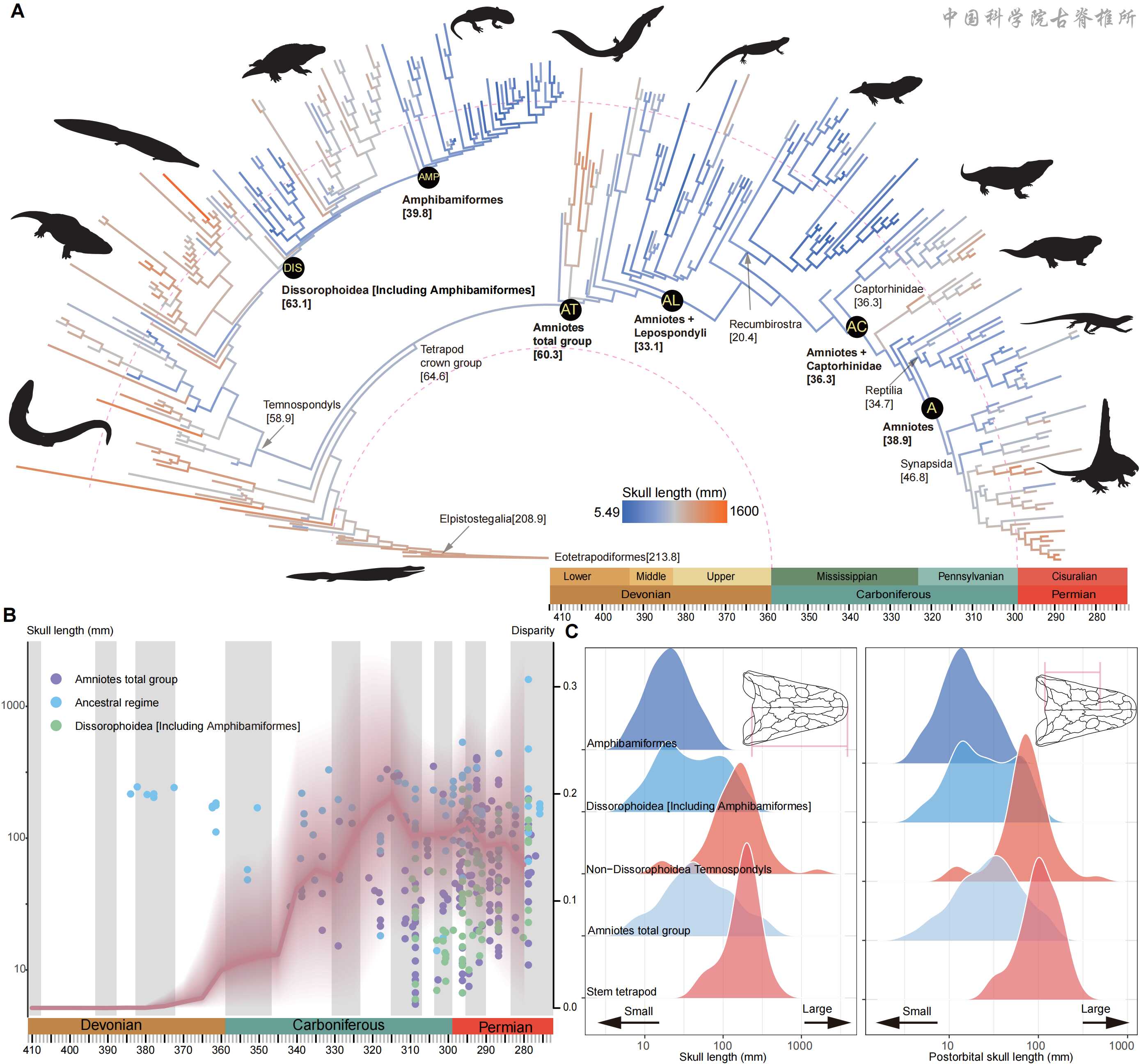 近日,国际著名学术期刊《科学.进展》(Science Advances)在线发表了美国自然历史博物馆余逸伦博士(原古脊椎所直博生),Roger Benson教授和我所徐星院士关于脊椎动物由水上陆及四足动物冠群早期分化的重要成果(题目:Decoupled phenotypic constraints framed by respiratory adaptation in the rise of land vertebrates)。该研究聚焦泥盆纪中期至二叠纪的早期四足动物,结合包含344个物种的新数据集和宏演化模型揭示了现生羊膜动物与滑体两栖类在体型演化可塑性、头骨形态及呼吸功能上的根本差异,在两大类群分化之初便已确定。这种深时的演化分异不仅奠定了现代陆地生态系统的基本格局,其发生时间更比现生类群的大规模辐射早了数亿年。