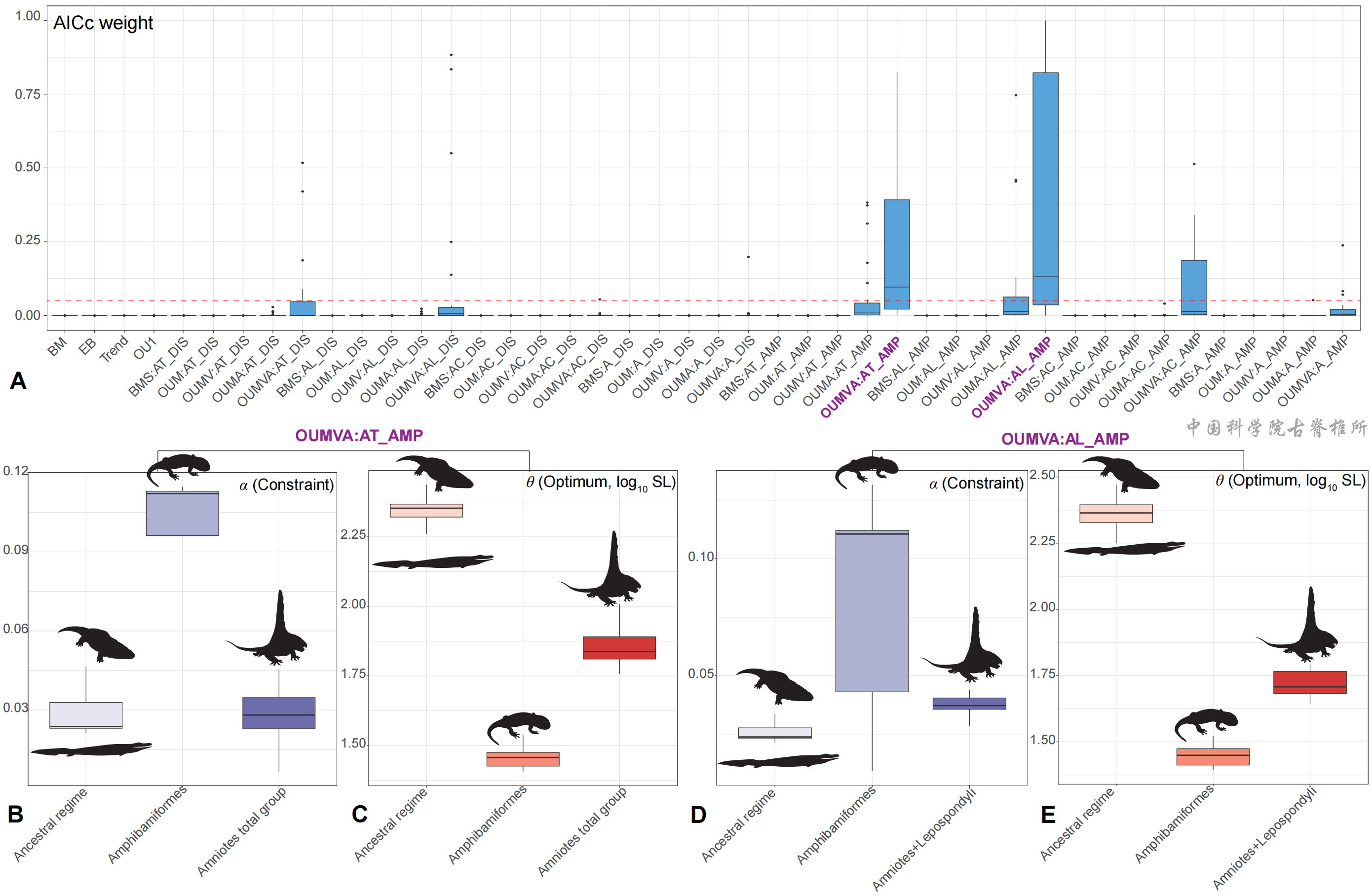 为了更严谨的对比不同早期四足动物类群体型的演化动力学差异,研究团队对比了多个宏演化模型,最终确定早期四足动物的体型演化服从多分区的奥恩斯坦.乌伦贝克过程(Ornstein-Uhlenbeck process)(图3A),并发现基干四足动物和多数离片椎类都占据了大型化的适应带,而羊膜类支系四足动物和两栖螈类都进入了小型化适应带。虽然羊膜类支系四足动物和两栖螈类相较于祖先类群都进入了小型化适应带,但两者的演化动力学特征存在显著差异:羊膜类表现出较低的演化约束,而两栖螈类则表现出极高的约束性。这种差异预示了羊膜动物具有更高的演化潜力,使其能够突破小型化适应带的限制,演化出更大的体型(图3B-E)。