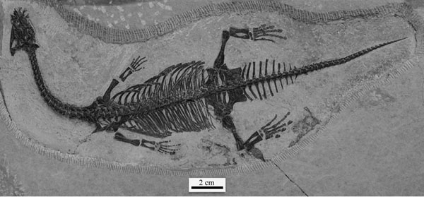 利齿滇东龙(Diandongosaurusacutidentatus gen. et sp. nov.) 正型标本(IVPP V 17761)(供图:尚庆华、李淳),一保存完整的骨骼(包括头骨、下颌和全部头后骨骼), 产自云南省罗平县中三叠世关岭组上段。