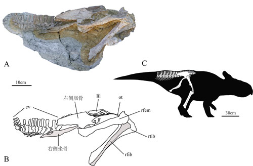 图1:诸城坐角龙正型标本侧视(A、B)及复原图(C) (贺一鸣供图)