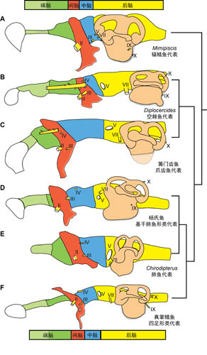 图3 泥盆纪硬骨鱼类各大类群脑腔对比示意图(卢静供图)。
