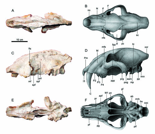 邓涛等人在最新出版的《古脊椎动物学报》(Vertebrata PalAsiatica)上报道了采自甘肃武都晚中新世晚期(距今725~530万年前)三趾马红土中的一件大型的恐剑齿虎头骨,代表一个雄性个体。这件头骨的顶线长度达415毫米,超过此前所有已知的剑齿虎头骨,计算得到其体重为405公斤。其解剖特征提供的新证据表明,即使在最大的具剑形犬齿的食肉目动物中也存在不同的捕杀方式,并揭示了在剑齿虎中导致功能和形态多样性镶嵌进化的另一种机制。