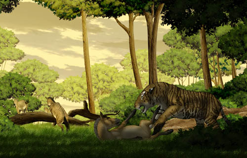 图2 恐剑齿虎捕猎场景(陈瑜绘)