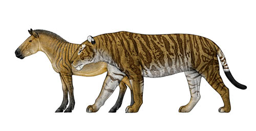 图3 恐剑齿虎与其主要猎物平齿三趾马的体型对比(陈瑜绘)