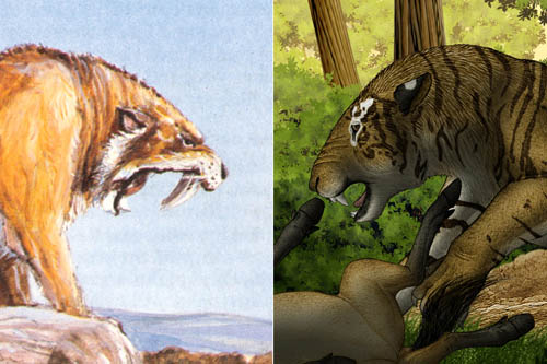 图4 恐剑齿虎与刃齿虎(Michael Long绘)口部开启程度的对比 (邓涛供图)