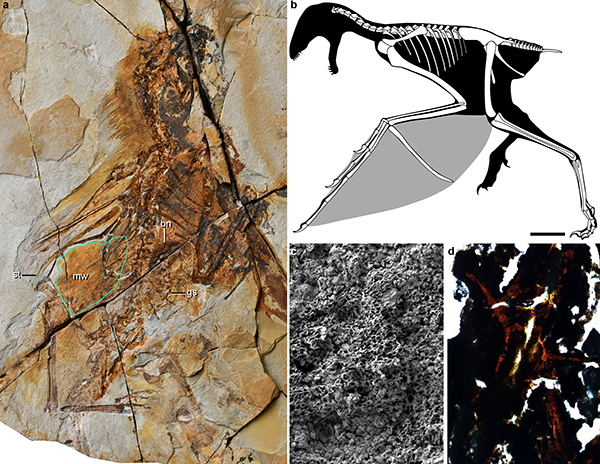 图2. a, 长臂浑元龙正型标本;b, 骨骼复原图;c. 膜质翼膜色素体;d. 骨质胃容物组织切片. bn, 骨质胃容物; gs, 胃石; mw, 膜质翼膜; st, 棒状长骨.(王敏供图)