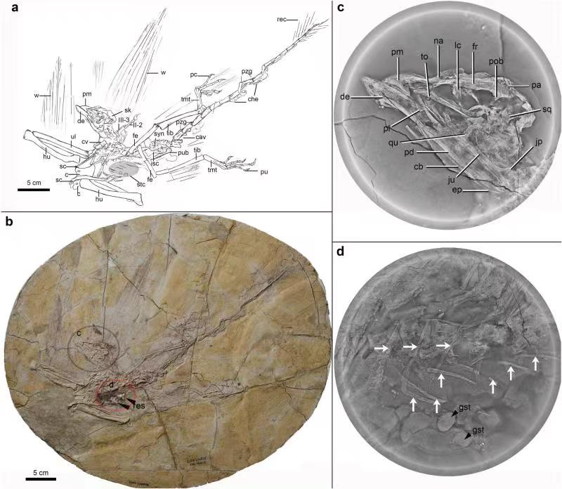 图1. 热河鸟标本(IVPP V14978)的线描、摄影和CL扫描