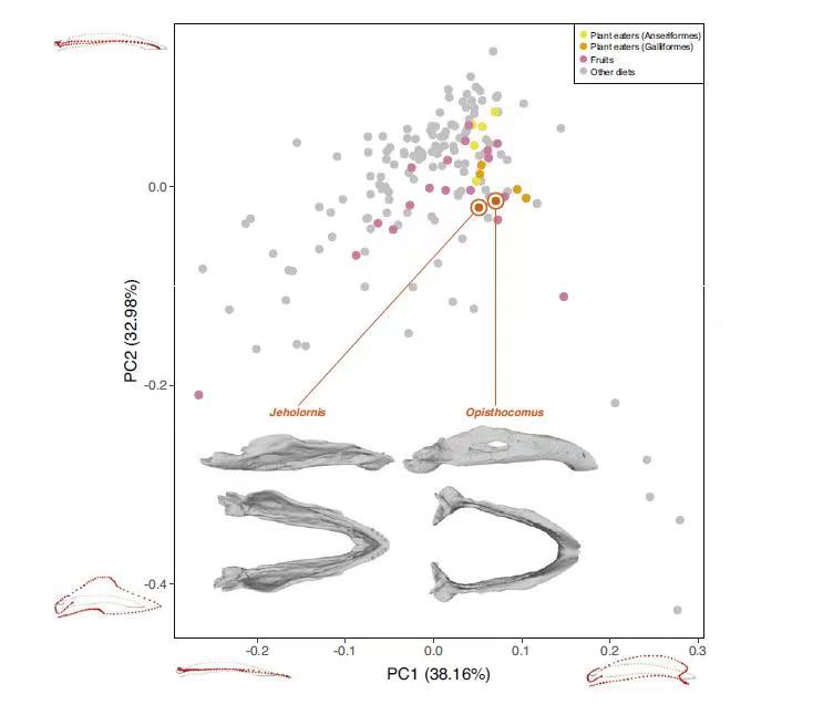 图3. 包括热河鸟和现存鸟类在内的三维下颌形状PCA图,重点与现存植食性鸟类对比