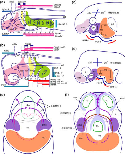 2012年7月和8月份出版的《科学通报》中英文版分别以封面文章刊发中国科学院古脊椎动物与古人类研究所盖志琨博士和朱敏研究员关于颌的起源研究的特约评述文章。 文章从分子生物学、发育生物学与古生物学等多角度评述了脊椎动物颌的起源研究中的最新进展。发育遗传学的一系列进展促成了颌演化异位理论的提出, 即颌的起源, 是在上皮-外胚层间质细胞相互作用中, 由于口腔发育调控基因的异位表达导致的一次演化上的创新。无颌脊椎动物缺少颌是因为外胚层间质细胞的向前生长受到中央鼻垂体板的阻挡, 而无法像有颌类那样发育成颌和颅桁(图1)。因此, 该理论推断无颌类鼻垂体复合体的分裂和颅桁的发育是颌发育的最根本的先决条件。