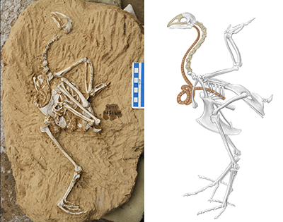 与现生鸟类一样,这种较长的气管多数情况只存在于雄鸟中。而这件标本还保存有另外一个明显的雄性个体特征,即跗跖骨(小腿骨)保存了与现生雄性雉类的距类似的隆起。