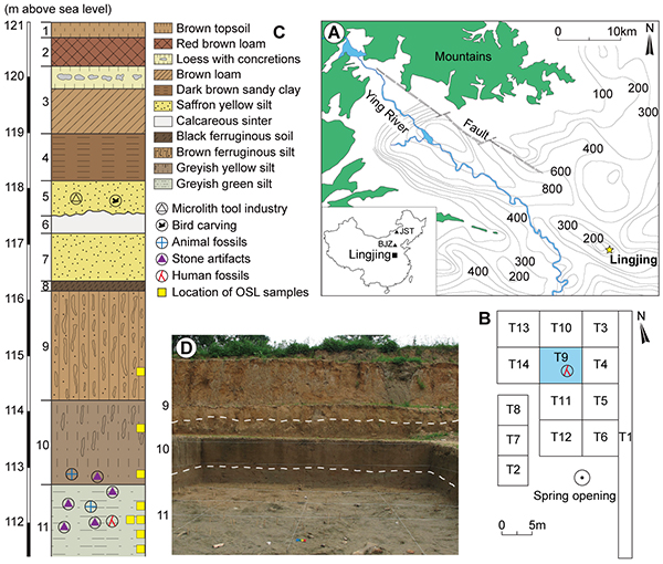 1:河南灵井许昌人遗址地理位置、布方、发掘和地层图(李浩供图)