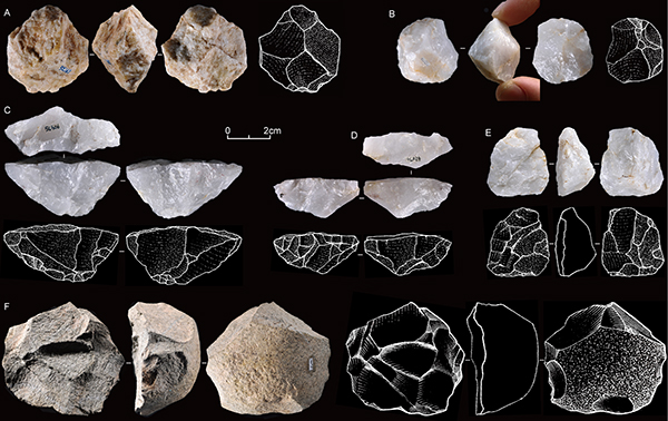 2:许昌人遗址出土石核:ab盘状石核;cd单台面石核;ef具有部分勒瓦娄哇技术特点的石核(李浩供图)