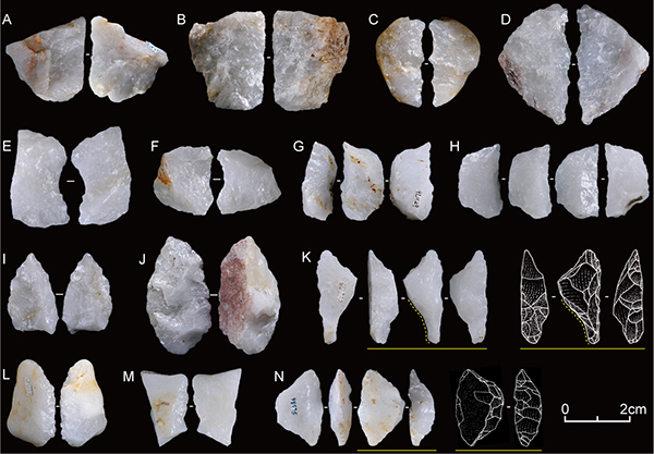3:许昌人遗址出土石器:ab刮削器;cd锯齿刃器;ef凹缺器;gh石钻;ijk尖状器;lm卵石毛坯的工具;n修背工具。k中黄色虚线指示尖状器底部的修理(李浩供图)