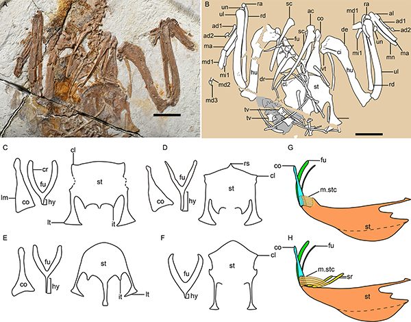 图2 原始鸟类胸骨前外侧突的发育情况,以及胸喙肌附着位置的变化。(王敏供图)