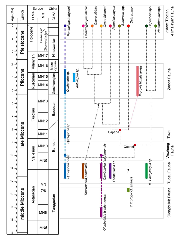 在中国,瑞典古生物学家布林于1937年曾报道过发现于青藏高原北部柴达木盆地一批保存较好的早期牛科动物的化石,当时布林已注意到这些化石中的某些类群与现代青藏高原上的某些羊亚科,如塔尔羊(Hemitragus)、藏羚羊(Pantholops)在角心形态上的相似之处,但限于当时的认识水平,并没有把这些材料与羊亚科的起源联系起来。后来的研究证明,出产柴达木盆地材料地层的时代从中中新世延续到晚中新世早期,与羊亚科起源的时间相契合。最近,中国科学院古脊椎动物与古人类研究所的研究人员对布林当年发表的材料,并结合新发现的青藏高原北缘的早期羊亚科化石进行了重新研究,证明这些材料与羊亚科的起源密切相关。研究发现,这些早期羊亚科材料可以分成两个类型,其一包括库羊(Qurliqnoria cheni)和托素羊(Tossunnoria pseudibex),有可能与现生青藏高原的一些本土类型,如藏羚羊(Pantholops)、塔尔羊(Hemitragus)相关;其二包括敖羚(Olonbulukia sp.)、小原大羚相似种(?Protoryx cf. P. enanus)、粗角羚相似属(cf. Pachytragus sp.)则可以与晚中新世晚期的欧亚大陆其它羊亚科类群联系在一起,并且很可能与现生羊亚科的起源相关。因此,研究人员推测,现代羊亚科在早期的演化中心很可能是中中新世晚期到晚中新世早期的青藏高原及其北缘地区。在这一时期,青藏高原发生了快速的隆升,海拔接近于现代的高度,其生态环境也急速向高海拔的极端生态环境发展。正是在这一背景下,早期的羊亚科动物很好地适应了寒冷和干旱的瘠薄生存环境,并在高原上快速发展、演化,最终在第四纪的冰期重新走出西藏,成为现代最成功的动物类群之一。 该研究最近于《Journal of Paleontology》在线发表。