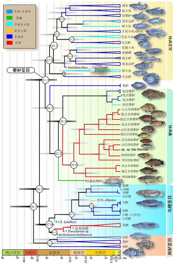 为化石属种。圈内数字为节点时间平均值。支系颜色代表分布区(见左上方框)。缩写:Ch.=Channa鳢属; Mi=Microctenopoma细梳攀鲈属(吴飞翔供图)