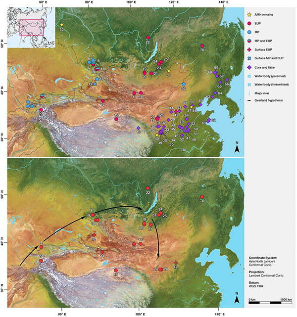距今约4万年前,中国西北地区出现了具有勒瓦娄哇技术特征的石叶遗存,代表性遗址如水洞沟遗址第1地点,这些遗存显示了明确的“西方”特征,与蒙古北部,俄罗斯西伯利亚阿尔泰、外贝加尔地区等发现的石叶技术遗存相近。针对这一现象,李锋、高星等曾提出中国旧石器晚期早段(Initial Upper Paleolithic)的石叶遗存是欧亚大陆西部的早期现代人人群扩散到中国的考古学证据,但并未对具体的扩散路径进行详细讨论,认为经由新疆、内蒙古、甘肃等地或经由蒙古北部继而向南扩散到中国西北地区皆有可能。也有学者指出自阿尔泰地区经由蒙古北部然后向南扩散到中国西部是主要的扩散路线,而包括新疆、内蒙古和蒙古南部的戈壁和沙漠环境不利于古人类的生存和扩散。