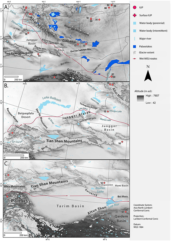 德国马普学会人类历史科学研究所的Michael Petraglia团队近年来的考古发现表明,阿拉伯半岛、印度北部等沙漠地区的古湖泊周围存在大量的考古遗址,曾是人类扩散和生存的关键区域,这改变了以往学术界对古人类适应能力的认识。中国西北沙漠地区晚更新世存在大量的古湖泊,个别区域地表发现了旧石器打制石器,故而我们认为晚更新世西北沙漠的部分地区满足古人类生存的条件,可能是古人类扩散的关键区域。基于此,我们结合中国北方、俄罗斯西伯利亚、蒙古、哈萨克斯坦、乌兹别克斯坦等地区晚更新世的旧石器遗址、古气候等数据进行了GIS最低成本路径分析。GIS模型显示,在氧同位素2阶段和4阶段两个相对较干的时段,沙漠区域或许难以支撑古人类的生存,自阿尔泰地区经由蒙古北部继而南下的扩散路线是最低消耗的路线,与以往学者提出的模型相近;然而在相对湿润的阶段,如氧同位素5阶段和3阶段,西北沙漠地区大量古湖泊的存在可为古人类的扩散提供条件,阿尔泰路线、天山路线以及塔里木路线皆可能是古人类扩散的路线。
