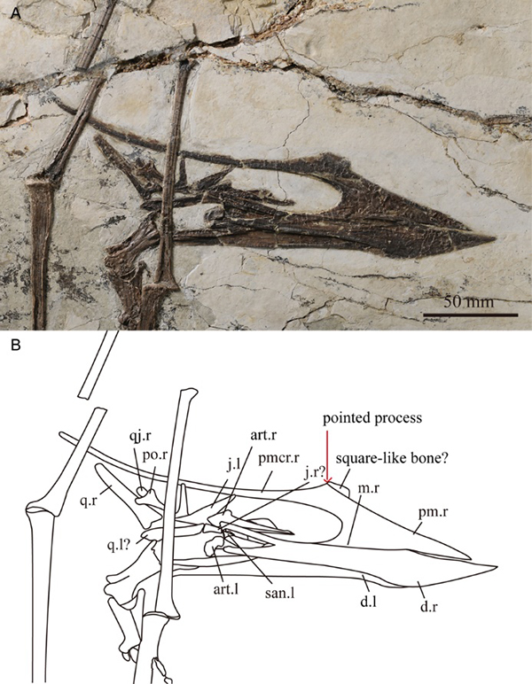 图2 返祖中国翼龙新材料头骨及线条图。(张鑫俊 供图)