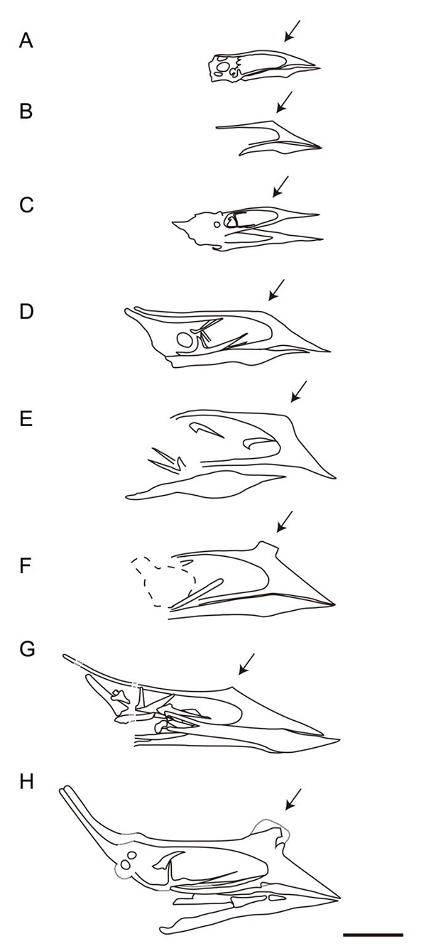 图3 目前发表的多个中国古神翼龙类头骨比较。A 董氏中国翼龙(= “谷氏中国翼龙”);B 返祖中国翼龙正型标本;C 凌源中国翼龙(Sinopterus lingyuanensis);D 董氏中国翼龙正型标本;E 董氏中国翼龙(= “季氏华夏翼龙”);F 具冠 “华夏翼龙”;G 返祖中国翼龙新材料;H 本溪 “华夏翼龙”。每一个箭头指示中国古神翼龙类前上颌骨脊转折处的形态变化。比例尺5 cm。(张鑫俊 供图)