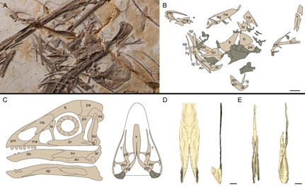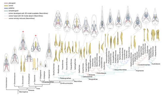 鸟类是唯一留存下的恐龙后裔。它们不仅跨过了约6500万年前的白垩纪大灭绝,而且成功演化成了如今多样性最高的脊椎动物之一。鸟类的成功演化与其种种有关飞行的结构相关,也与其特殊的头骨构造密不可分。从非鸟兽脚类恐龙到真正的鸟类,头骨发生了一系列变化,如面部缩短、脑颅扩大、眼眶周围骨骼退化,以及骨骼纤细化和彼此间关节退化消失。尤其特殊的是,现生鸟类主要是新腭类具有高度可动的头骨,体现在其上颌能够相对于脑颅进行灵活地移动,而非鸟恐龙的头骨则不具备这样的可动性。