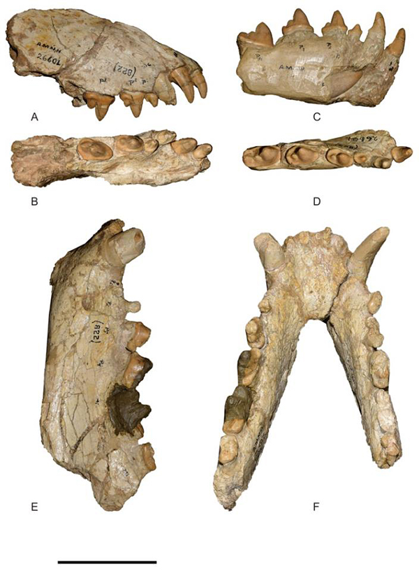 最近,中科院古脊椎所博士研究生江左其杲等在Papers in Palaeontology在线发表了关于中国北方宁夏同心和甘肃和政地区戈壁犬的新材料,包括数件上下颌材料。作者详细地对比了内蒙古通古尔地区的巨颌戈壁犬Gobicyon macrognathus(模式种),认为同心地区中中新世早期的戈壁犬形态更加原始,P4原尖较大,M2较大,存在M3,应该代表早期的戈壁犬,建立新种叶氏戈壁犬Gobicyon yei sp.nov.,种名献给为同心地层古生物做出巨大贡献的叶捷先生。同心可能年代稍晚的材料和通古尔的材料十分接近,归入巨颌戈壁犬。和政牙当的戈壁犬形态更加进步,前臼齿粗壮化,P4原尖退化,M2明显缩小,代表已知最进步的戈壁犬,建立新种尖齿戈壁犬Gobicyon acutus sp.nov.。同时在同心地区发现了半颗下裂齿,但这颗下裂齿有明显的下后尖,符合哲氏戈壁犬Gobicyon zhegalloi的特征,增大了这个种已知的分布(之前只发现在蒙古西部和中国新疆北部)。