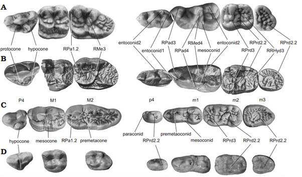 图1,A大熊猫,B始熊猫,C德宁格尔熊,D戴氏祖熊牙齿对比及术语。