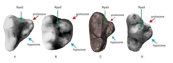 图2.部分食肉目成员P4齿尖结构示意图。A狗獾,B浣熊,C德氏泛熊,D元谋始熊猫。