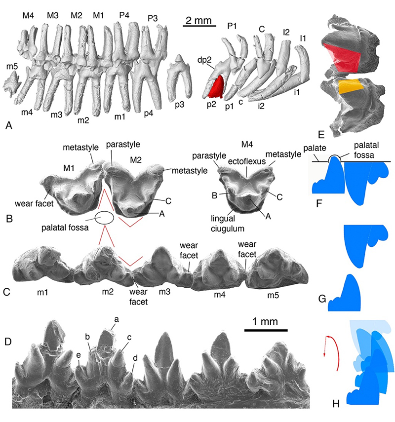 图二. 李氏源掠兽(Origolestes lii)牙齿形态、磨蚀细节和咬合运动关系 (毛方园 供图)