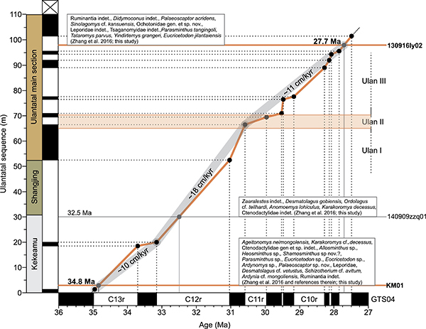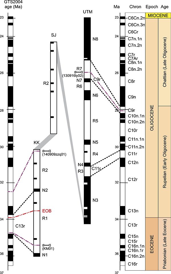 建立了首个乌兰塔塔尔古地磁年代框架,为动物群转换、代表干旱化的风尘沉积的出现提供了相对精确的年代约束。结果表明:所研究的剖面连接起来从晚始新世一直延续到晚渐新世,年代范围为35Ma-27Ma,跨越E-O界线。其中克克阿木剖面为35Ma-32.5Ma,其最底部化石层(KM01) 34.8Ma早于蒙古国湖谷地区(Valley of Lakes) Biozone A;上井剖面为32.5Ma-31Ma;乌兰塔塔尔主剖面为31Ma-27Ma