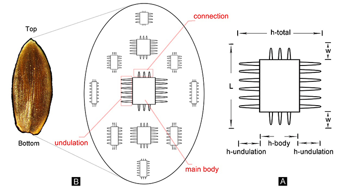 和β这一稃片类型植硅体,在本文中统一命名为Interdigitating,这一名称涵盖了所有这一类型的植硅体)具有更高的分类能力。通过对Interdigitating这一类型植硅体的特征进行分解,研究人员一共获得4个有效的形态特征,分别是:主体的形状(main body),乳突的形态(papillae),两侧分支的形态(undulation)以及两端交接部位的形态(connection),利用这4个形态特征及其测量指标,能够从形态和形态参数两方面有效的区分黍、粟、稗、狗尾草、求米草、雀稗和马唐属的植物。