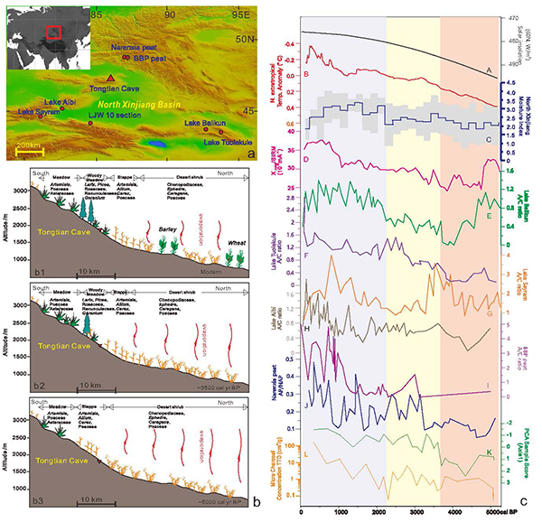 图4. 通天洞遗址周边植被变化及区域气候指标对比.(周新郢供图)