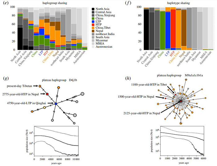 为了进一步揭示青藏高原古代人群的遗传联系,研究人员构建了单倍群网络,来看人群之前的遗传关系,结果发现了以两个单倍群为代表的两次人群扩散。第一次是D4j1b单倍群的网路图以4750BP的LTP青海宗日遗址样本为中心,向2775BP的HTP尼泊尔样本以及现代西藏人群辐射的现象,显示出距今4800-2800年 LTP人群与HTP人群有联系。第二次是M9a1a1c1b1a单倍群的网路图以2125BP的HTP尼泊尔样本为中心,呈现出向1100BP的HTP以及现代西藏人群辐射的现象,显示出距今2100-1100年HTP人群互相有联系。假设由LTP向HTP的农业传播也带来了大量的人群迁徙和永久定居,研究人员期望应该能观测到更多的单倍群扩增现象,然而并未观察到该现象,因此本研究并不支持低海拔向高海拔地区具有大量的人群迁徙。