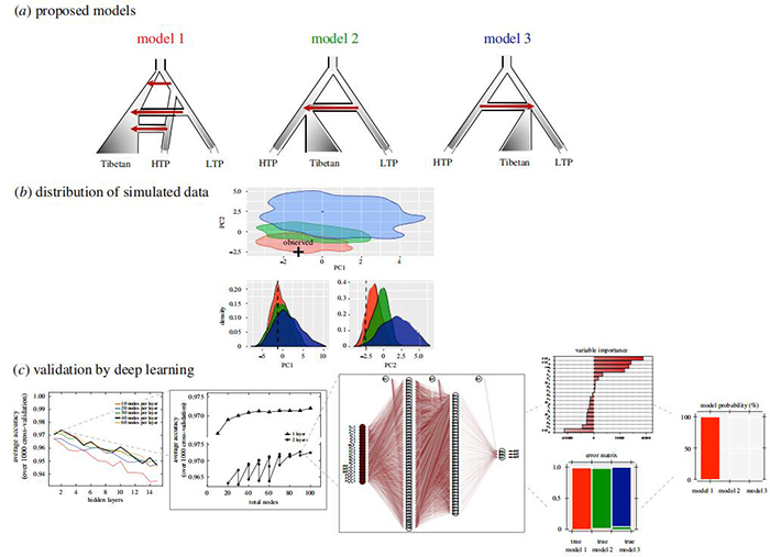 图2. 青藏高原人群形成的模型选择 (a). 三种可能的青藏高原人群演化模型 (b). 模拟分析 (c). 机器学习分析