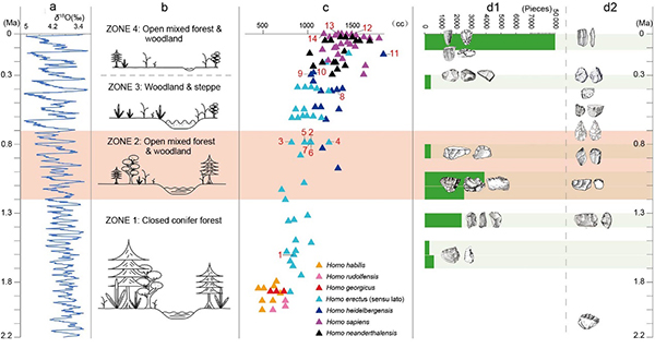 图4 更新世气候环境、脑容量发展和泥河湾及其他遗址代表性石器文化(杨石霞供图)