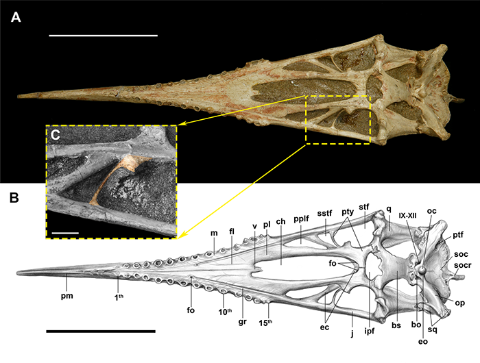 由于翼龙飞行需要减轻重量,它们的骨骼细长中空,很难保存化石,即使保存也大多不完整。近年来,虽然在我国辽西及周边地区的热河生物群和燕辽生物群发现大量保存完整的翼龙骨架,但几乎都呈二维压扁状态保存,很少能够显示有关翼龙类腭区的标本,国内外对翼龙头部这一重要区域的详细研究鲜有报道。众所周知,脊椎动物头骨特征对于鉴别属种及研究各类群之间系统发育关系最为重要,由于对腭区相关骨骼特征的认识不足,必然会影响到翼龙系统发育及演化关系的研究。因此,对翼龙头骨腭区的详细形态学研究显得尤为重要。