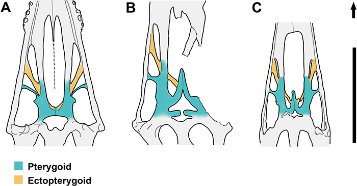 由于魏氏准噶尔翼龙头骨较完整,都呈三维立体保存,为翼龙的腭区的形态学研究提供了非常理想的材料。这次研究通过对多件魏氏准噶尔翼龙腭区每一块骨骼的详细形态观察和对比,发现准噶尔翼龙在颚区的主要特征变化集中在翼骨的形态上:翼骨的外侧支,从形态上由内向外可分为两部分,其中外侧部分细长且呈现类似于开口朝下的抛物线状;两侧翼骨的内侧支向内相接,构成平滑的翼间窝前缘。此外,翼间窝双拱形后缘也是准噶尔翼龙独有的特征。