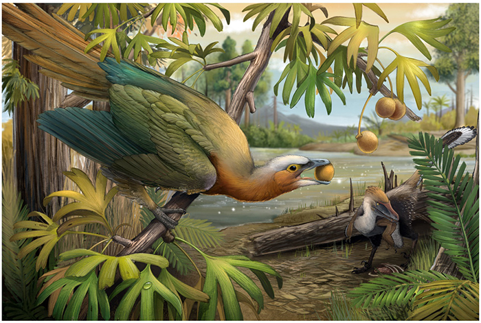 图1 植食性古鸟类 (左)和小型掠食性恐龙(右)的生态复原场景。与肉食性恐龙同处在一个生态系统下的中生代鸟类,演化出不同的取食习性,例如以种子、果实为主的植食性和以小型昆虫为食的杂食性,避免了直接与肉食性恐龙的食物竞争。(郑秋旸 绘图)