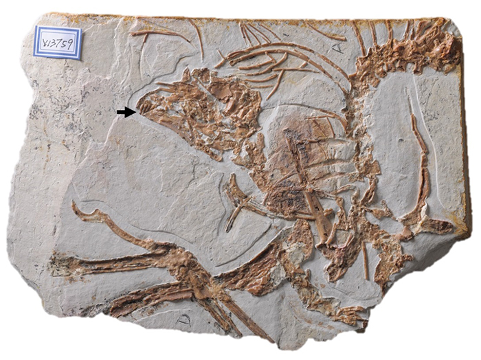 图2 白垩纪早期古鸟类-会鸟的化石标本。收藏于中国科学院古脊椎动物与古人类研究所。(黑色箭头标示牙齿位置)。(李志恒 供图)