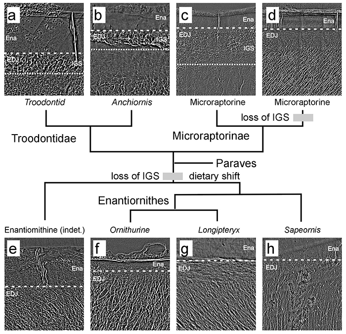 研究团队通过同步辐射的高解析穿透式X-光显微镜,对小型非鸟类恐龙-包含伤齿龙、近鸟龙、小盗龙,以及古鸟类(见图2)-包含今鸟类、反鸟类、会鸟、热河鸟等牙齿的微结构进行对比观察和研究,发现尽管简单的釉质层在早期古鸟类中都有保留,但牙釉质与牙本质之间的多孔罩牙本质层(图3IGS所示)皆已消失,而多孔罩牙本质(porous mantle dentin)层被认为是肉食性恐龙牙齿中发育的、避免其在掠食过程中牙齿断裂的特殊避震保护结构。不仅在古鸟类中,本次研究的一种小盗龙标本的罩牙本质层也已经消失。这意味着鸟类与部分亲缘关系相近的恐龙,其牙齿不再需要特殊的力学保护结构;间接证实了其在饮食习惯,如咬合力与掠食性方面,与肉食性恐龙产生了极大差异,通过食性转换避开了与肉食性恐龙对食物生态位的竞争,适应能力极大提高,度过最艰难的时刻。相较于古鸟类的普遍性植食或杂食化的演进趋势,虽然非鸟类恐龙的少数类群,如小盗龙,也发生了趋同演化,但仍难以避免灭绝的危机。