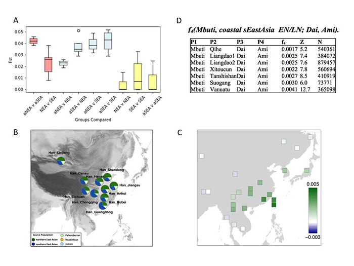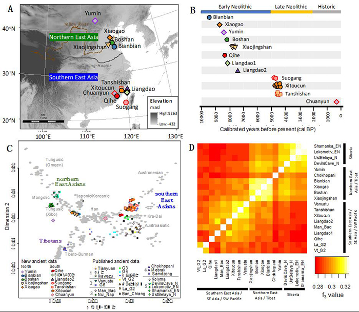 研究所涉及新石器时代早期人群样本,包括来自北方山东、内蒙古地区5个遗址(扁扁洞、小荆山、小高遗址、博山遗址、裕民遗址)距今9,500-7,700年的7个个体,及南方福建、台湾海峡2个遗址(奇和洞、亮岛)距今8,400-7,600年的3个个体。通过研究这些人群的基因组发现,在沿着黄河流域直到西伯利亚东部草原的人群,至少从9,500年前起都携有一种以新石器时代山东个体(图3)为代表的古北方人群成分而中国大陆沿海及台湾海峡岛屿人群至少从8400年前起就携有一种以新石器时代福建及其毗邻岛屿个体为代表的古南方人群成分(图1C和D),且这两种成分截然不同(图3A)。然而随着时间的推移,东亚大陆南北方人群之间的这种差异性和分化程度逐渐缩小(图4A),这种变化暗示着自新石器时代以来南北方之间频繁的人群迁移与混合。此外,在8,300-7,700年山东人群中发现古南方人群联系(图2B)及在约8,300亮岛1号人发现有少量古北方人群的影响(图2D),反映南北方人群已经开始互动。