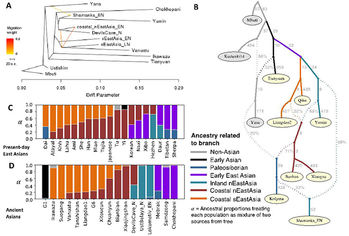 图2:古代亚洲人群之间的系统发育图。(A)Treemix分析得到三次迁徙事件的最大似然性系统发育树。(B)古代亚洲人群之间的系统发育图,实线表示分支,虚线表示混合事件并显示了混合比例。(C)(D)现今东亚人群与古代亚洲人群的遗传结构对比图,在图(B)的基础上计算了更多人群的遗传成分组成,以不同颜色表示不同遗传成分,以颜色占比表示不同成分的混合比例。