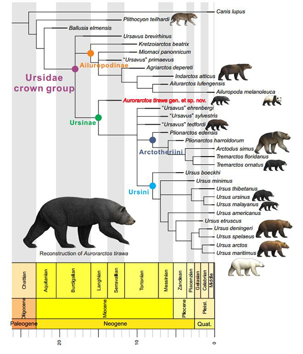 最近,古脊椎所博士研究生江左其杲和美国自然历史博物馆John Flynn合作,在国际期刊iScience上在线报道了最早的熊亚科化石提拉瓦曙熊Aurorarctos tirawa。属名来自罗马神话的曙光女神欧若拉,而种名来自大平原中部印第安人神话中的创世神,以纪念化石在熊类演化中的重要地位。化石来自于美国中部Nebraska的情人组(Valentine Formation)地层,时代为中中新世。这批化石把熊亚科的最早记录往前推了500万年,并与最早的大熊猫亚科化石证据在时代上相吻合。通过一个详细的系统发育树,研究人员不仅论证了曙熊属于最早的熊亚科,还指示了过去很多被笼统归入祖熊Ursavus的物种实际上属于不同的支系。祖熊的模式种短吻祖熊Ursavus brevirhinus可能属于熊科的干群,欧洲常见的原始祖熊Ursavus primaevus属于早期的大熊猫亚科,而我国南方的林祖熊Ursavus sylvestris已经属于熊亚科的成员。原始祖熊,林祖熊等都应该建立新的属以区分于模式种,但是这方面涉及到很多材料,需要更详细的分类修订工作。
