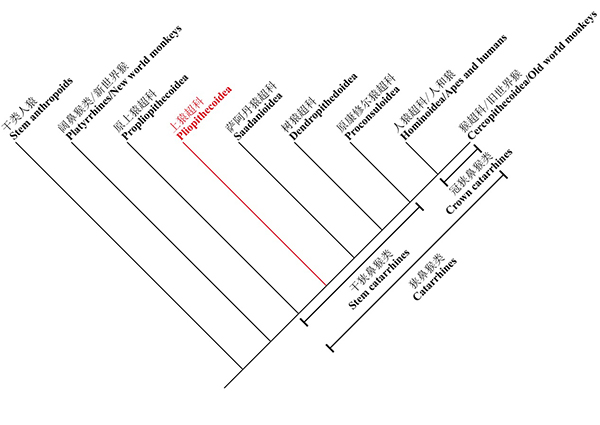 图1 灵长目类人猿下目中部分主要类群系统发育关系示意图(红色分支为上猿超科所在位置)(张颖奇 供图)