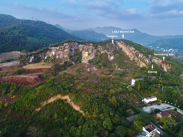 图2 金氏繁昌上猿化石产地鸟瞰(中部偏右塘口裂隙;人字洞遗址在最右侧)(张颖奇 供图)