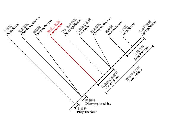 上猿超科可以被划分为四个科,分别为醉猿科(Dionysopithecidae)、上猿科(Pliopithecidae)、克鲁泽尔猿科(Crouzeliidae)和克里希纳猿科(Krishnapithecidae)。中国早中新世晚期的醉猿科(包括醉猿属Dionysopithecus和宽齿猿属Platodontopithecus)代表了中国乃至整个欧亚的早期上猿超科干群成员;欧亚中晚中新世的上猿科(包括上猿属Pliopithecus)和克鲁泽尔猿科(包括近上猿属Plesiopliopithecus、丄猿属Anapithecus、池猿属Laccopithecus、埃加拉猿属Egarapithecus和巴尔韦拉猿属Barberapithecus)较醉猿科拥有更多的衍生特征;晚中新世的克里希纳猿科仅包括印度衍生程度更高的克里希纳猿属(Krishnapithecus)中的一种。形态对比与系统发育分析的结果(图4)表明,繁昌上猿属于克鲁泽尔猿科克鲁泽尔猿亚科的干群成员。