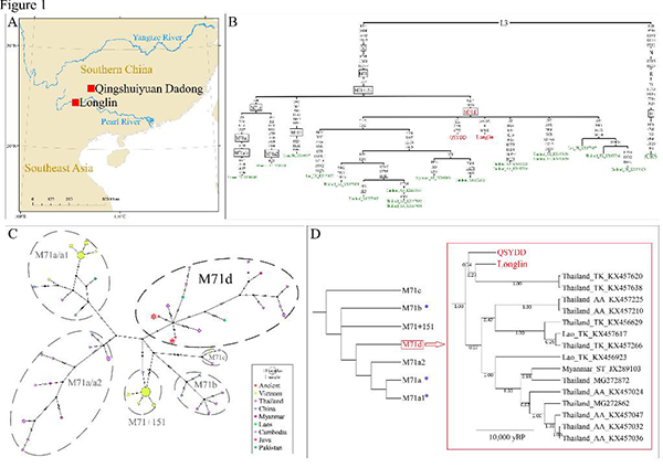 序列分析显示隆林和大洞样本的线粒体序列均属于M71单倍群,除此之外,二者还共享编码区6257A和11518A两个突变位点。研究者进一步对两个古个体,及有报道的来自中国南部及东南亚的4784条现今现代人和82条古线粒体全基因组数据进行了分析。结果显示,6257A和11518A两个突变位点,仅存在于东南亚现今现代人样本中,在东亚现今现代人样本中未观察到。基于此,研究者在M71单倍群命名的基础上,增加了6257A和11518A两个突变位点,命名为M71d单倍群。系统发育分析显示大洞及隆林样本属于M71d单倍群的早期类型。贝叶斯法和Rho估计均显示M71d单倍群起源于2,2000年左右。系统发育网络(Network)分析也显示隆林和大洞样本位于M71d单倍群基部。以上结果说明,可能在一万一千年乃至更早时期,东亚南部到东南亚存在自北向南的人群迁移,然而由于没有同时期的东南亚样本,还需要进一步研究来验证这一假说。