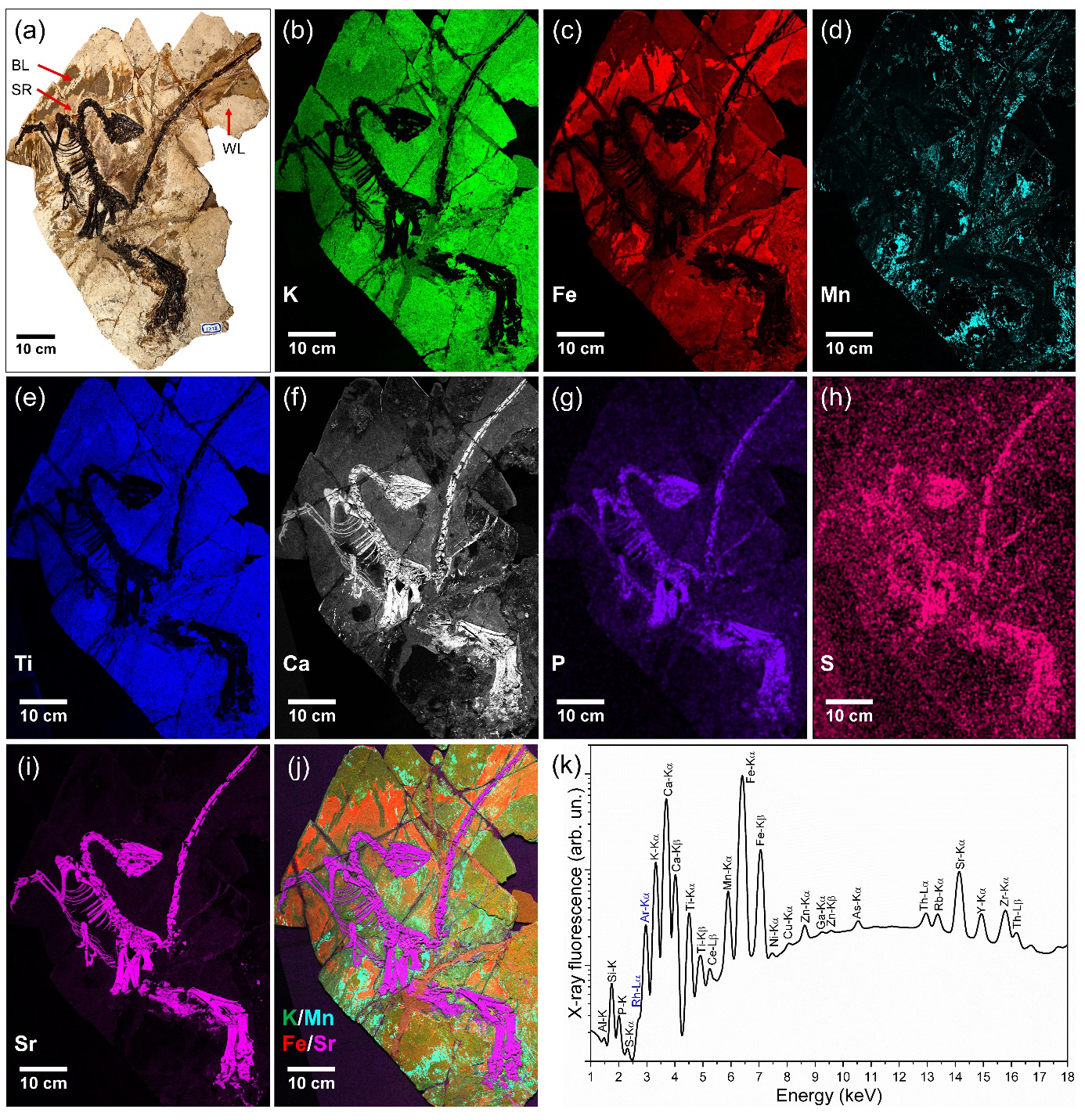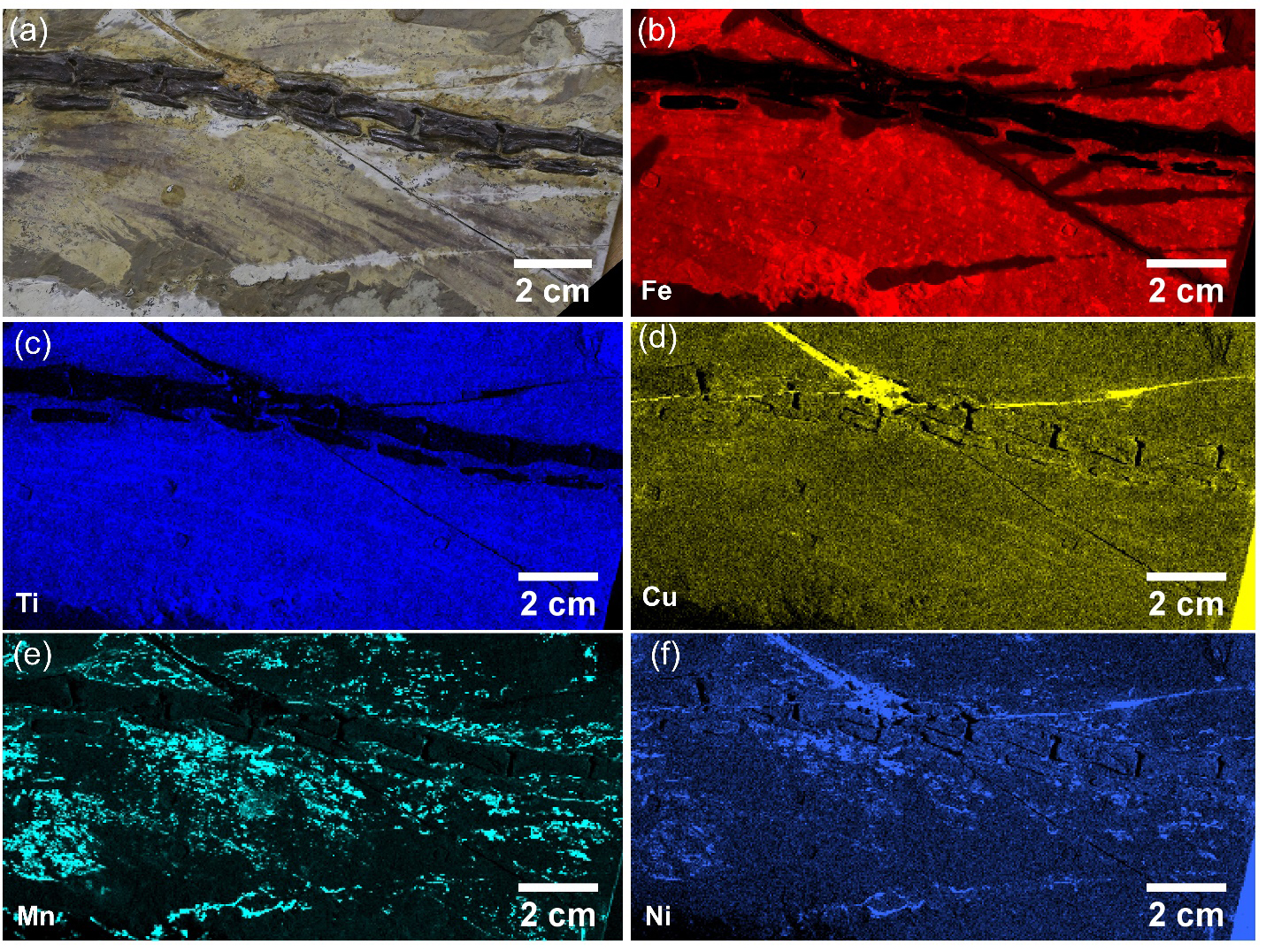 图1. 首张大面积微米分辨率恐龙化石X射线荧光元素分布图(艺术图)