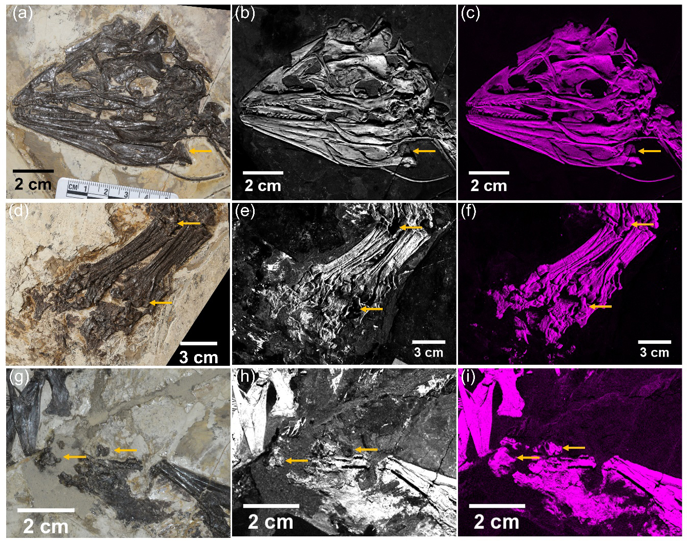 图6. 嘉年华龙头骨、后腿和腰带部位的CaSr元素分布图。箭头指示部位为骨骼损伤造成Ca元素的流失