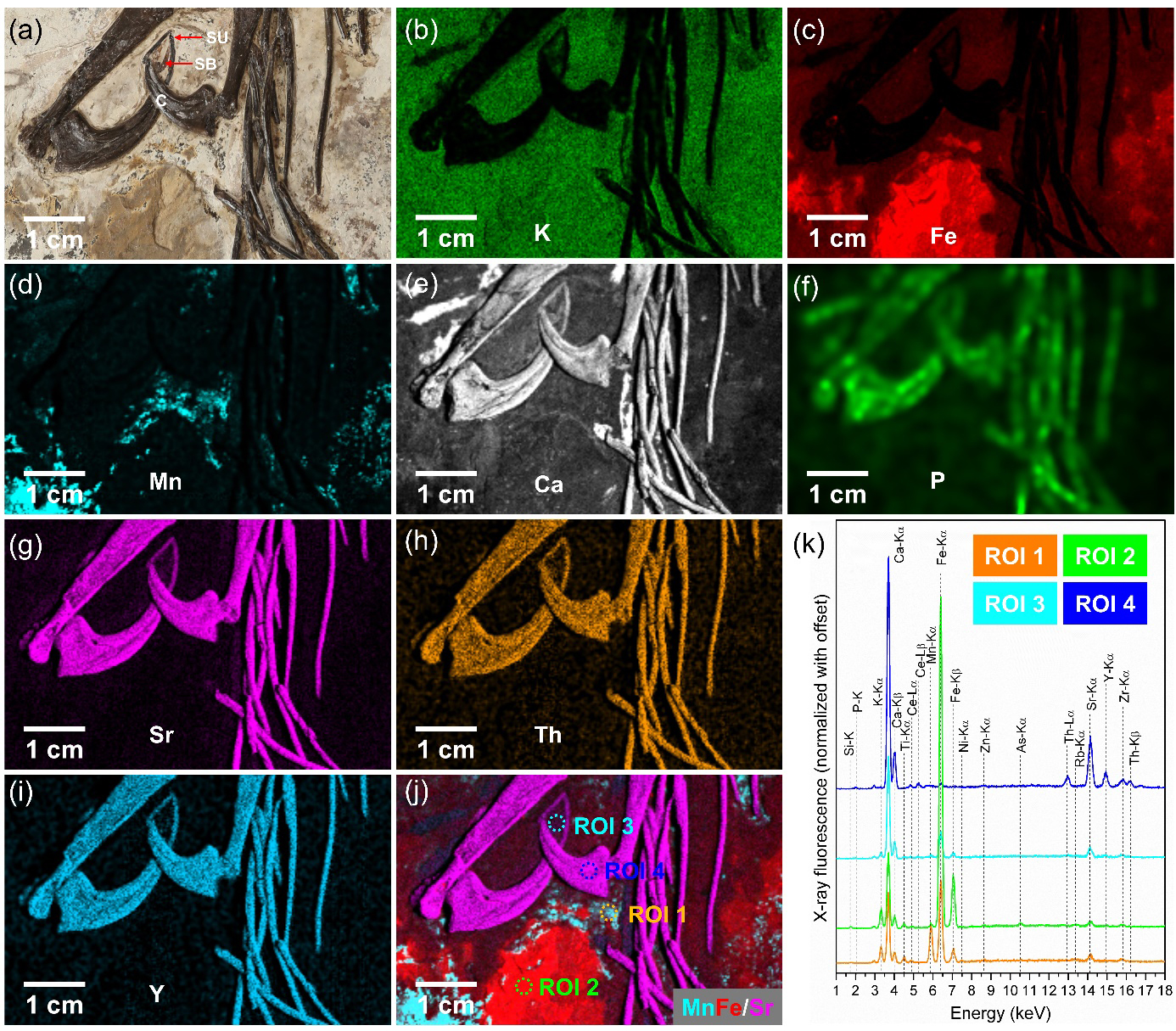 通过长达6天的连续扫描及后续精细的数据处理,该研究获得了如下结果:1)化石的围岩由KFeTiCaAlSi等元素组成,指示其为凝灰岩。化石骨骼富含CaPS,表明化石化骨骼保存仍以磷灰石为主。与围岩相比,化石骨骼部分富含SrThYCe等元素,指示了磷灰石骨骼对这些元素的选择性吸附作用。2)化石的羽毛部位富含TiCuMnNi元素,可能指示了羽毛的原始化学成分(比如Cu元素的存在可能指示羽毛含有黑色素体),或指示埋藏过程中由于羽毛软组织的降解过程造成了一些矿物的选择性原位沉积。3)在埋藏和保存过程,化石的机械损伤更容易造成骨骼中CaPS元素的流失,然而骨骼中吸附的SrThYCe元素则相对稳定。同时由于围岩这些元素的含量相对低,采用SrTh的元素成像,能获得边界更清楚、对比度更好的化石骨骼图像。4)化石的骨质爪和爪鞘各结构均富含CaP,然而二者相比,骨质爪的SrThYCe明显比爪鞘部位偏高,表明骨质爪和角质爪鞘在化石化过程中存在差异。